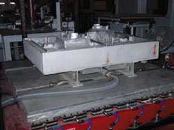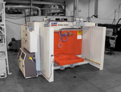 Стандартная модель включает в себя роботизированный механизм, заключенный в стальной корпус. Двухсторонний поворотный стол может принимать и закреплять детали весом 1,000 фунтов, а также перемещать детали со сторонами 3 фута на 5 футов (иногда даже детали большей длины и меньшей ширины), вводить их внутрь камеры и выводить наружу менее чем за три секунды. Таким образом оператор может снимать готовые детали в то время как неготовые детали проходят процесс резки кромки внутри камеры. Помимо этого производители могут модифицировать систему по своему усмотрению, добавлять различные дополнительные функции, в том числе еще один роботизированный механизм, податливое лезвие от КМТ запатентованной конструкции, устройство автоматической смены инструмента и другое. ________________________________________ Зажимная система Компания Lenzkes Clamping Tools Inc. предлагает зажимные системы для производственных механизмов любых видов. На выставке «Thermoforming Show», прошедшей в Цинциннати, компания Lenzkes представила свою систему для процесса термоформования. Усилие зажима каждого устройства достигает 18,000 фунтов. Благодаря тому, что система изготовлена из особого сплава кованой стали, она может удерживать на месте любую пресс-форму, большую или маленькую. Эта запатентованная технология привлекает внимание некоторых производителей оборудования для термоформования, которые рассматривают возможность включения данной системы в свои стандартные машины.